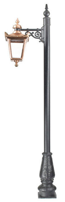 This enchanting set is unique in design with the bracket supporting the lantern from the finial rather than the base. The top fix light is made in copper and is complemented perfectly by the ornate bracket.