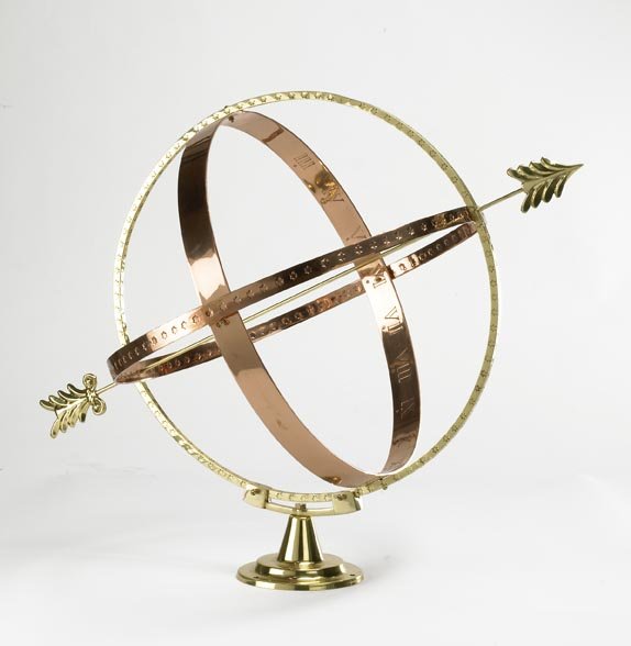 The armillary has a minimalist design, but it is filled with intricate detailing, such as the etched roman numerals on the copper sphere and the brass arrow.